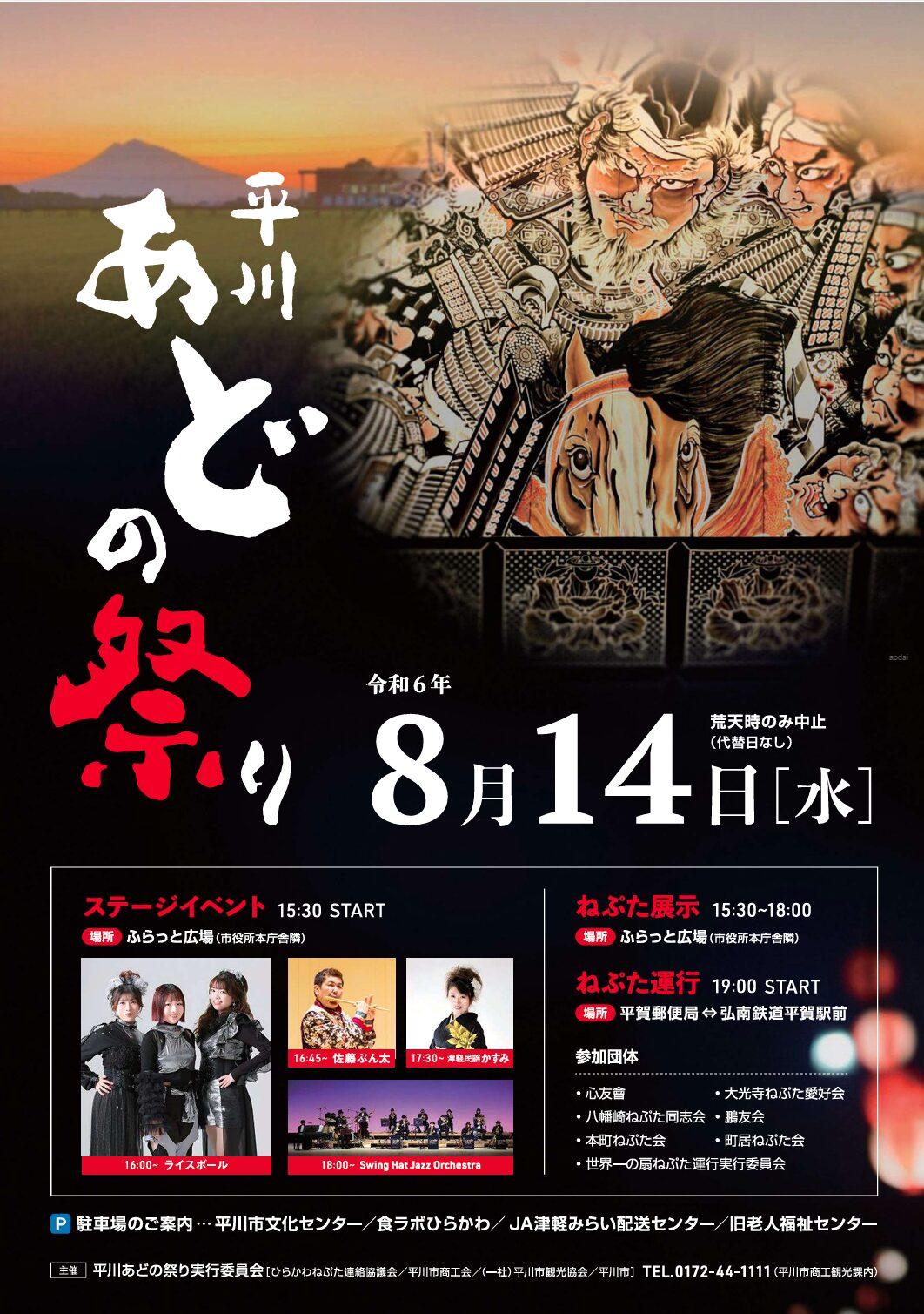 平川ねぷたまつり令和6年8月2~3日に開催される平川ねぷたまつりを見られなかった方や、お盆期間に帰省する方に平川ねぷたを楽しんでいただくため、平川あどの祭りを開催します。開催日時令和6年8月14日 水...