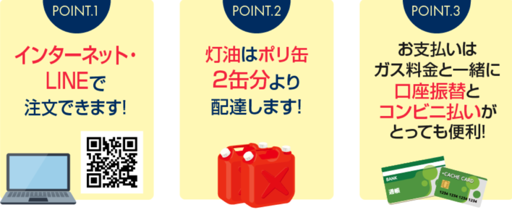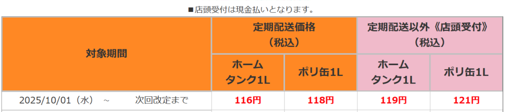 - 定期配送サービスを提供しており、灯油の価格は市況に応じて変動します。定期配送は10月中旬から4月30日まで行われます。