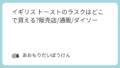 - 他のフレーバー: イギリストーストには、さまざまなフレーバーがあり、例えば「南部せんべい入りピーナツクリーム」や「チョコスプレー&チョコホイップ」なども人気です。これらのバリエーションを試すことで、異なる味わいを楽しむことができます。