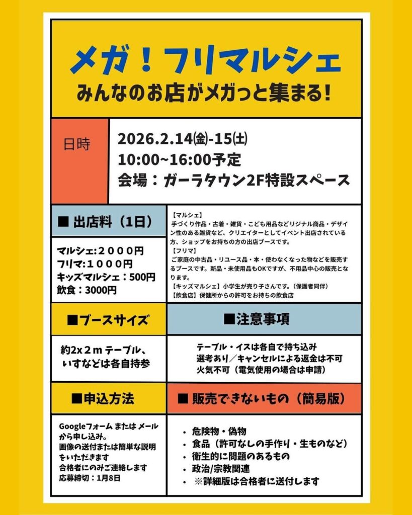 新年1発目のイベントが決定しました!規模なんと 100店舗!フリマとマルシェを組み合わせた、その名も… 【メガ!フリマルシェ】✨✨ (会場がメガドンキ様の2階なので“メガ!”です😆) しかも今回は 一度きりの開催!春からリニューアル工事に入る前の “800坪のフロア” を、みんなで自由に使える特別企画です。 リニューアル後に「昔ここでみんなでフリマしたね〜!楽しかったよね〜!」と語り合えるような、記念イベントにしたいと思っています。 ⸻