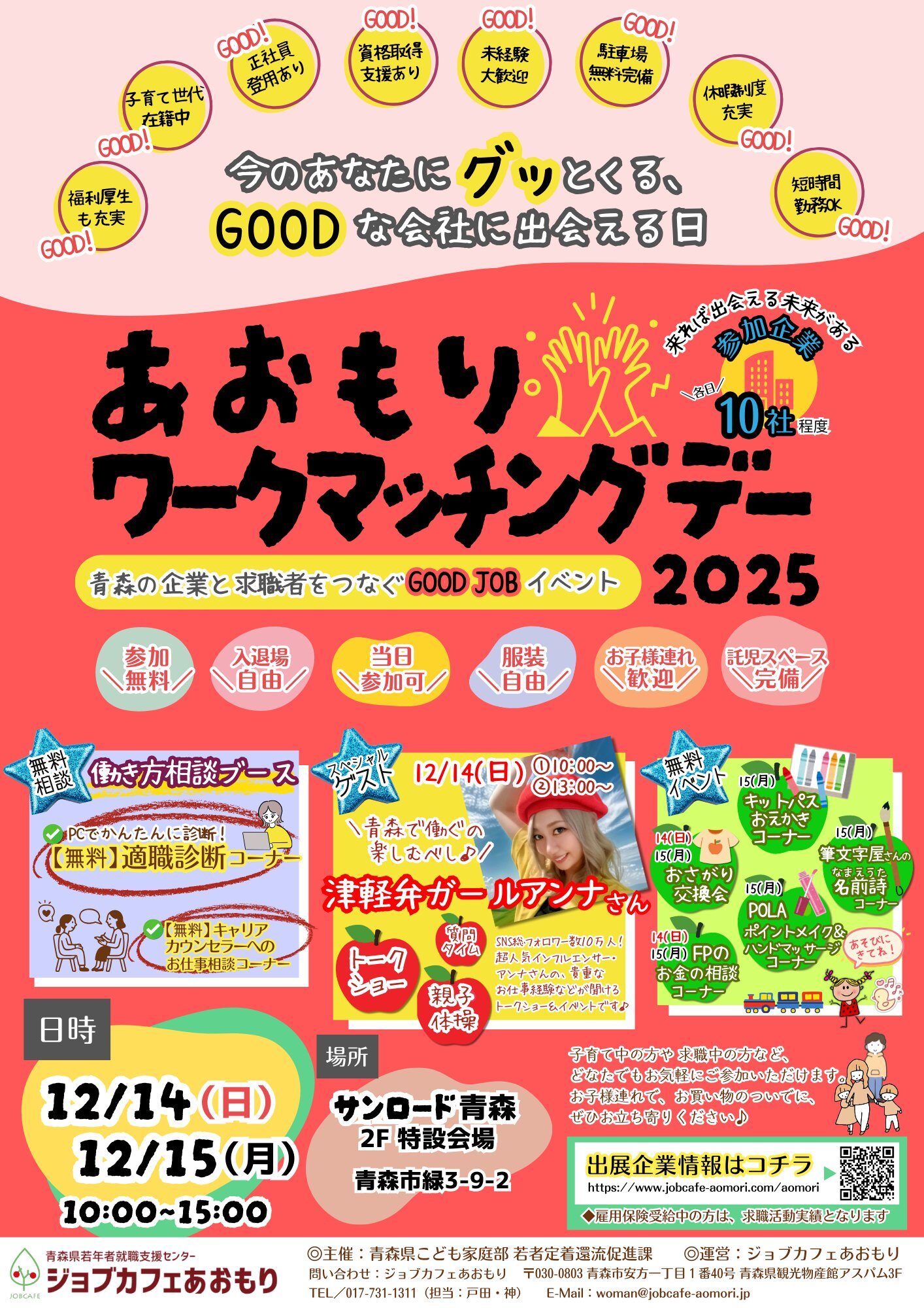 このイベントは、青森県こども家庭部若者定着還流促進課が主催しており、求職中の方や子育て中の方々が気軽に参加できるように配慮されています。特に、子育て中の女性が働く機会を得るための支援が強調されています.