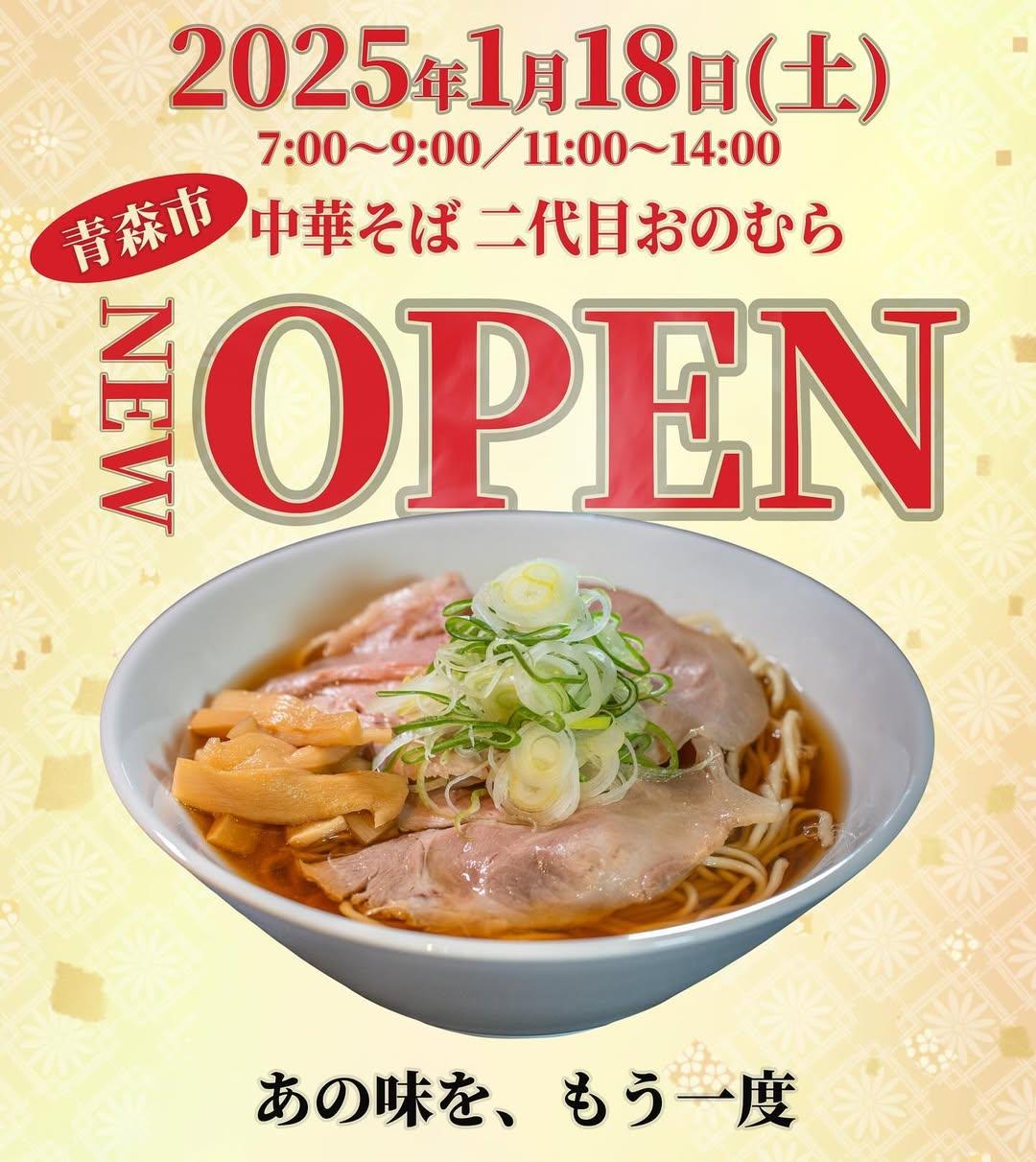 1/18(土)7:00より、いよいよグランドオープンいたします。 2022年、惜しまれつつ閉店した青森市浪岡の名店 “中華そばおのむら”初代の元で修行をし、この度“二代目”として受け継がせていただきま...