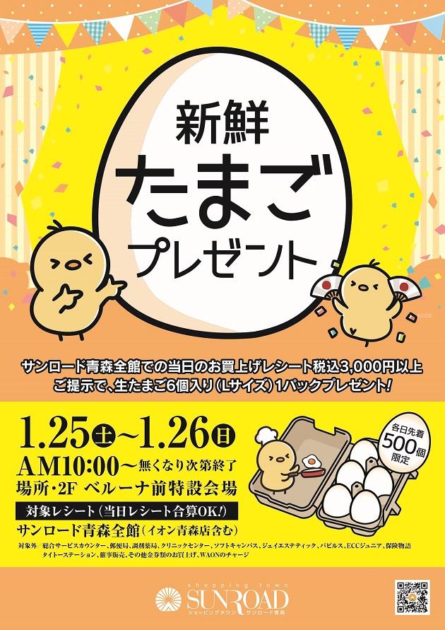 サンロード青森全館(イオン青森店含む)で当日お買い上げいただいたレシートの合計金額が税込3,000円以上の方に、新鮮な生たまご6個入り(Lサイズ)1パックをプレゼントします。開催日時: 1月25日(土...