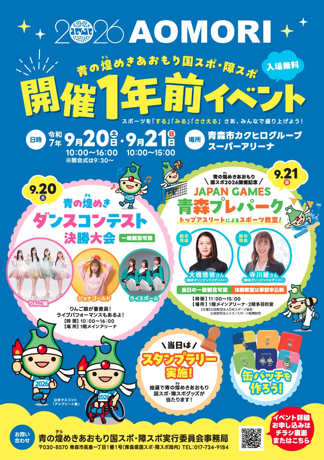 209月(9月 20)10:00 AM21(9月 21)3:00 PM青森市 青の煌めきあおもり国スポ・障スポ「開催1年前イベント」