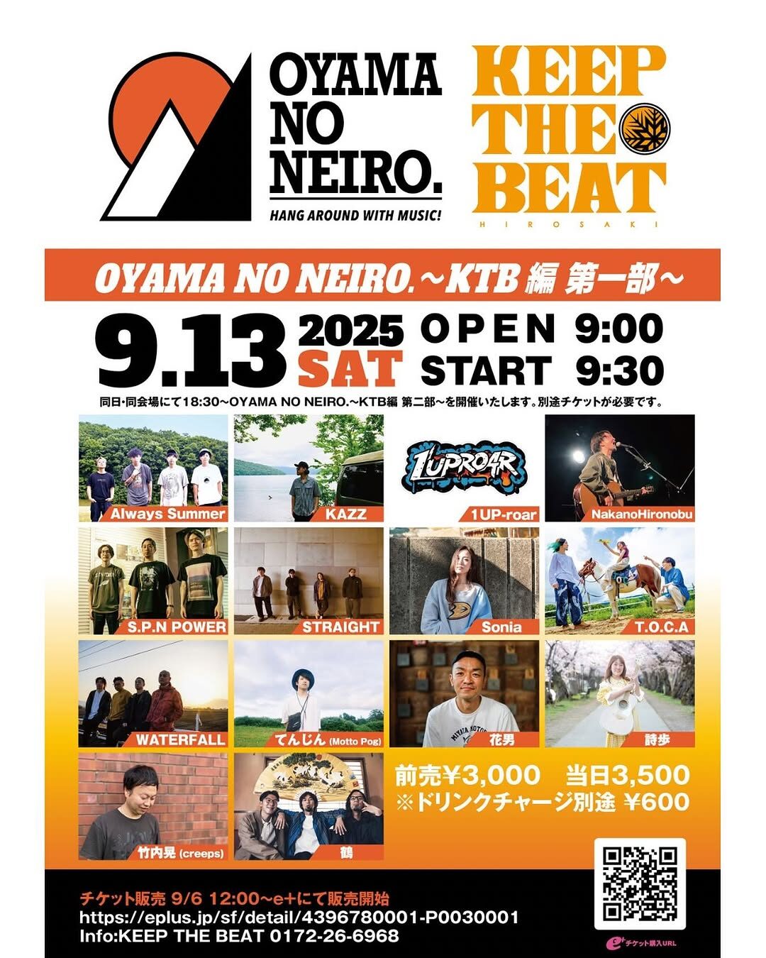 【延期と代替公演】公式アナウンスの通り、「OYAMA NO NEIRO.」は延期となりました。代替公演として同日に二部構成の「OYAMA NO NEIRO.〜KTB編〜」を開催!我々は第一部に出演🫡2025.9.13(土)@弘前KEEP THE BEAT開場9:00/開演9:30前売3,000円+1D▼e+(9/6 12:00~)https://t.co/psJL2o1TWJ https://t.co/9gJz4DIgh1 pic.twitter.com/zl7g1xFJzK— T.O.C.A (@TOCA_2014) September 5, 2025