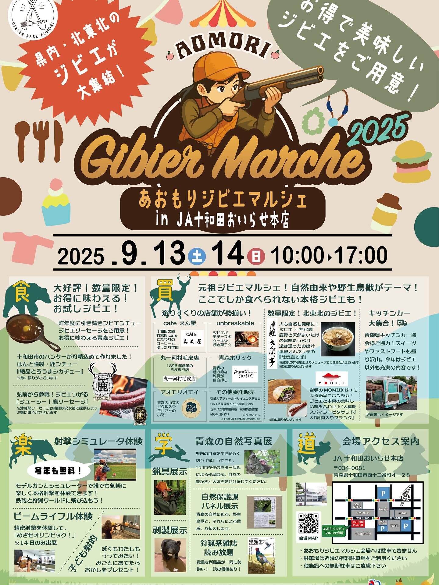 139月(9月 13)10:00 AM14(9月 14)5:00 PM十和田市 JA十和田おいらせ本店「あおもりジビエマルシェ」