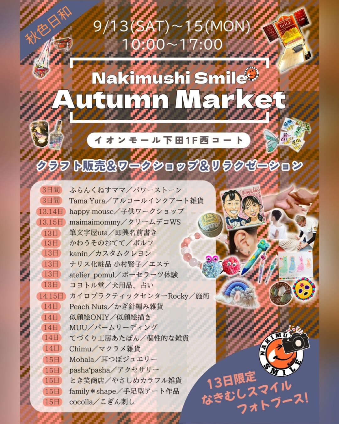 139月(9月 13)10:00 AM15(9月 15)5:00 PMイオンモール下田「なきむしスマイル Autumn Market」