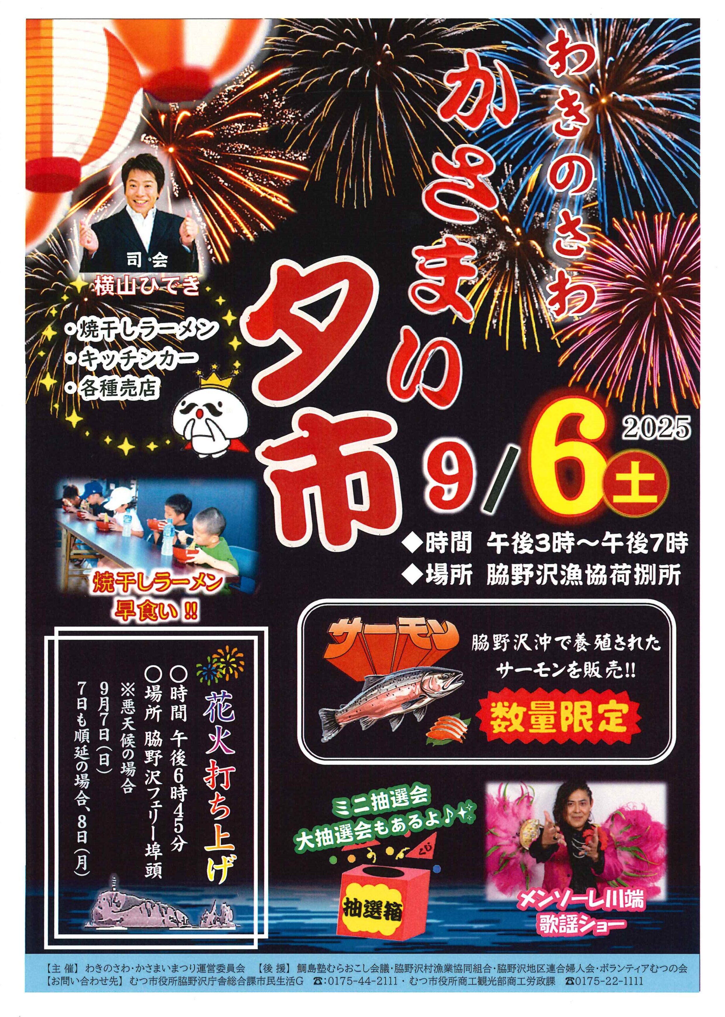 【わきのさわ・かさまい夕市を開催します!】地元産品や焼干しラーメン、キッチンカー出店のほか、脇野沢沖で養殖されたサーモンの販売も行ないますので、たくさんのご来場をお待ちしております。 【お問合せ】脇野沢庁舎総合課市民生活G(内線62)0175-44-2111 pic.twitter.com/2TR1S2gshJ — 青森県むつ市 (@mutsukoho) August 25, 2025