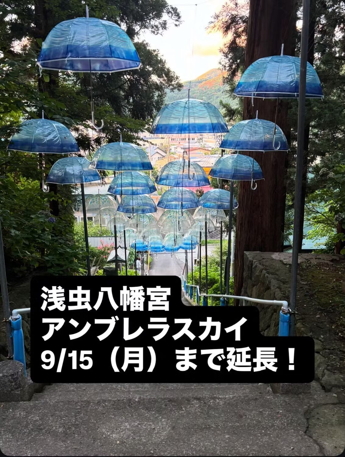 【浅虫花火大会開催日まで延長決定!】連日たくさんの方にお越しいただいております浅虫八幡宮・アンブレラスカイ。※たまたまですが昨日もお客さんの記念撮影お手伝いをさせていただきました。浅虫温泉花火大会に合わせて8/31→9/15(月・祝)まで延長となりましたので告知致します! pic.twitter.com/KnYiJ7Lwj8— ♨浅虫温泉勝手に応援ツイッター (@katte_asamushi) August 25, 2025