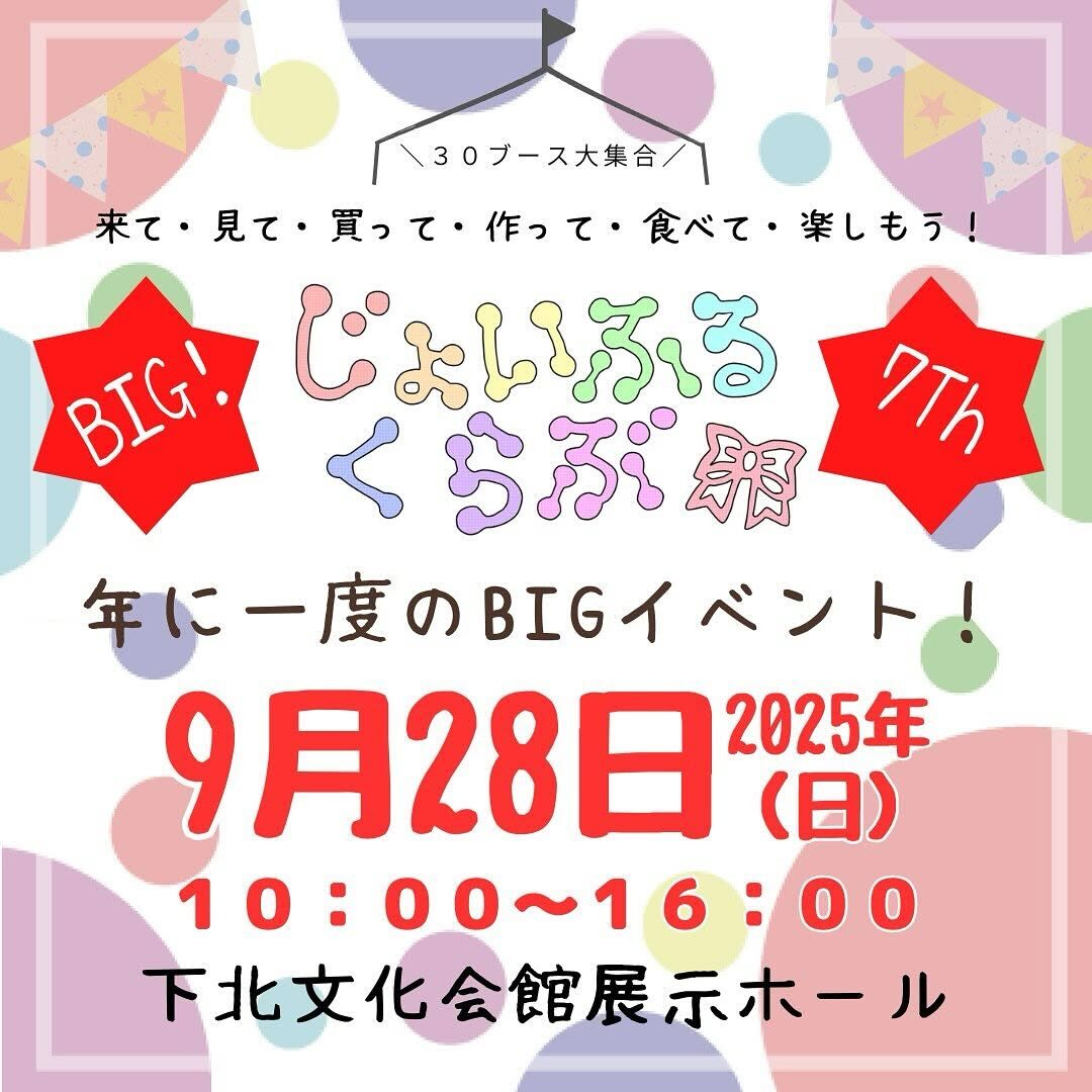 2025じょいふるくらぶBIG開催決定‼️ 今年は30ブースでお待ちしてます🥰 楽しいイベントも企画していきますよ✨お楽しみに👌 ꙳✧˖°⌖꙳✧˖°⌖꙳✧˖°⌖꙳✧˖°⌖꙳✧˖°⌖꙳✧˖°⌖꙳✧˖°〜年に一度!じょいふるくらぶのお祭り『BIG!』30のブースとお楽しみがたくさん〜2025年9月28日(日)10:00~16:00下北文化会館 展示ホール #じょいふるくらぶ #じょいくら #じょいふる #じょいふるくらぶBIG#じょいくらBIG#青森県 #むつ市 #クラフトイベント