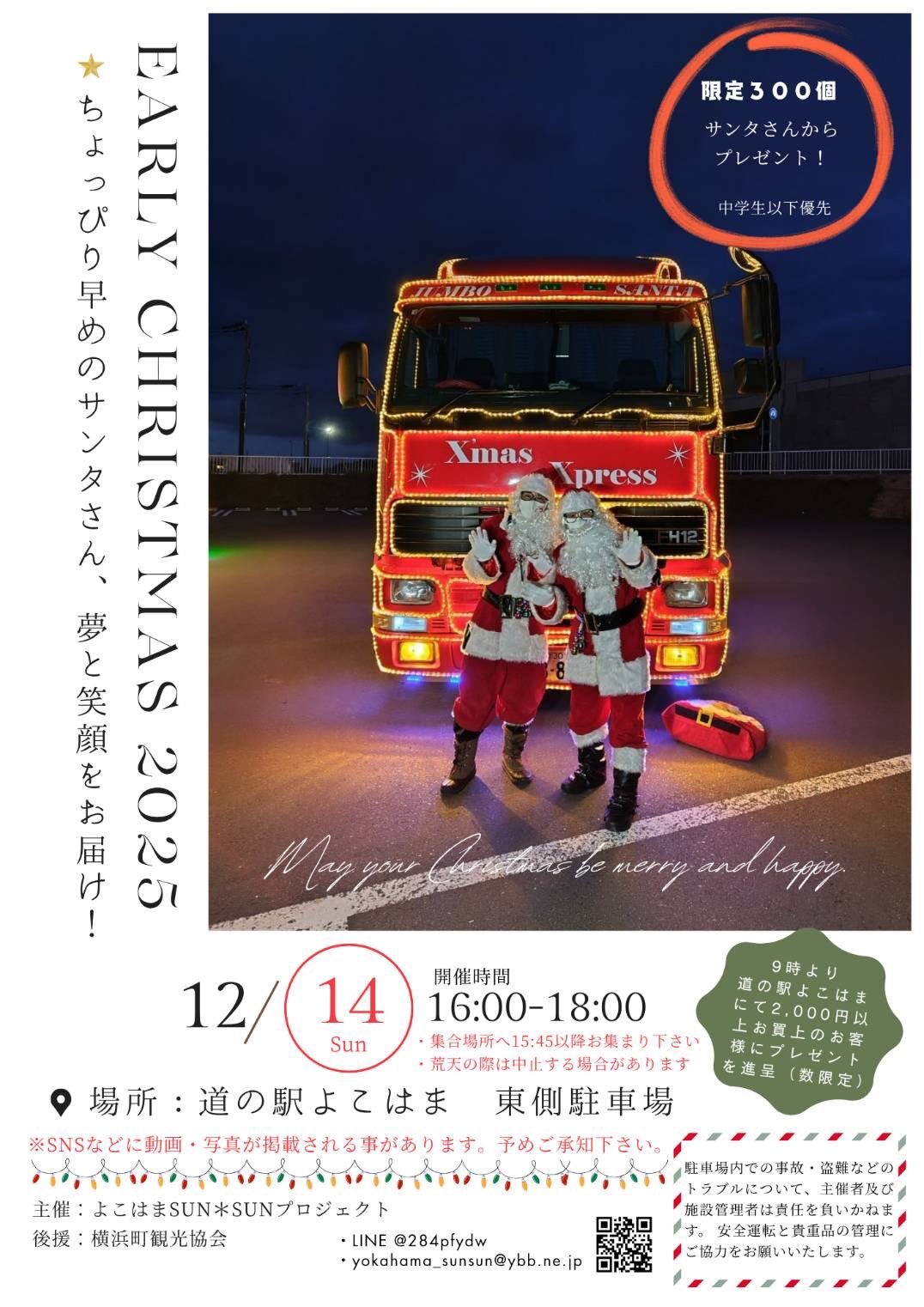 12/14 横浜町のポスターお知らせです🚍⭐️Early Christmas 2025主催:よこはまSUN*SUNプロジェクト @yokohama_SUNsun 場所:道の駅よこはま東側駐車場 https://t.co/7ciBXr5Y2C pic.twitter.com/m77W2Zn8Jw — 神出鬼没🌕みんなのサンタ号🤶⭐️🚌=33 (@itotrading_xmas) November 23, 2025