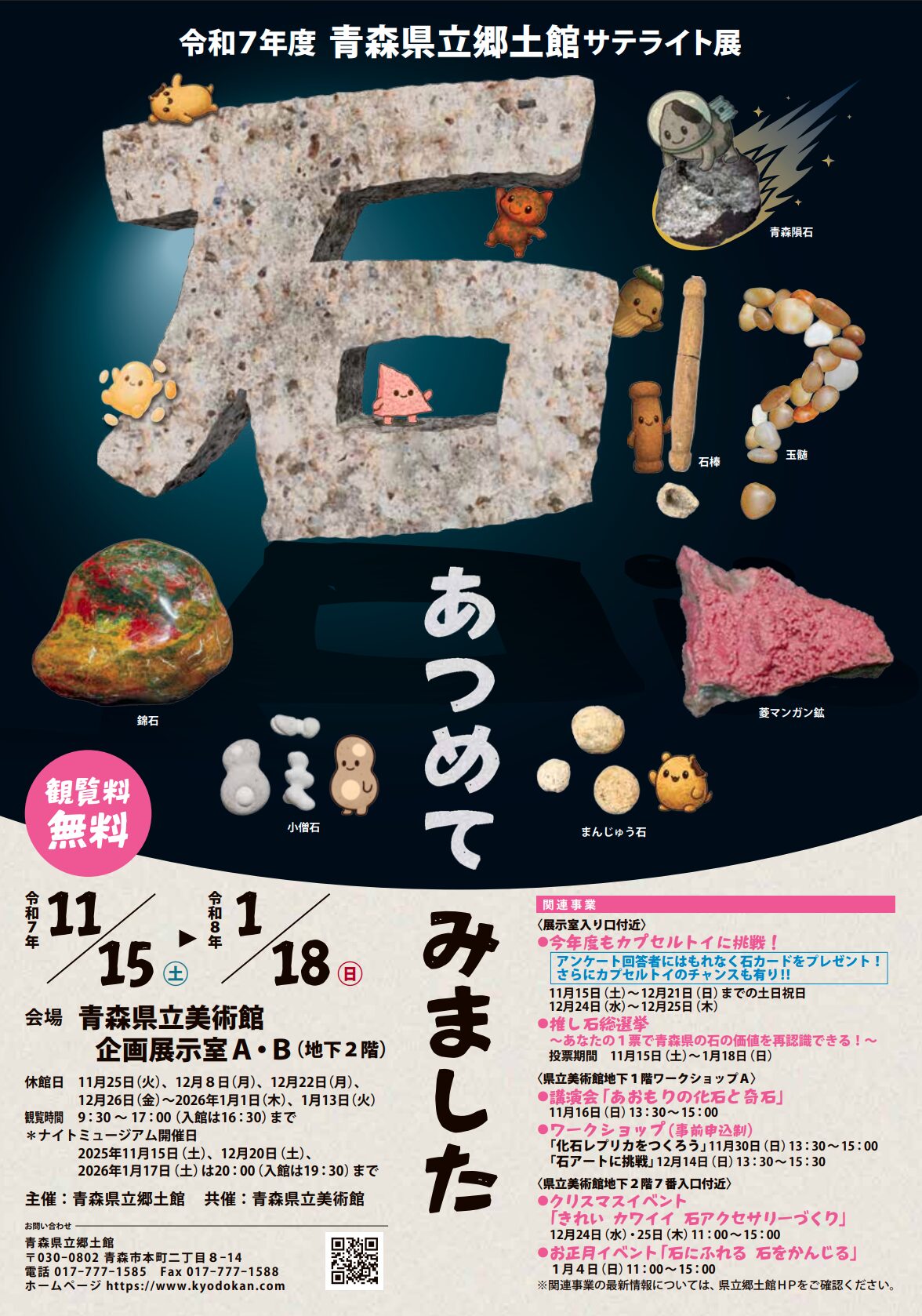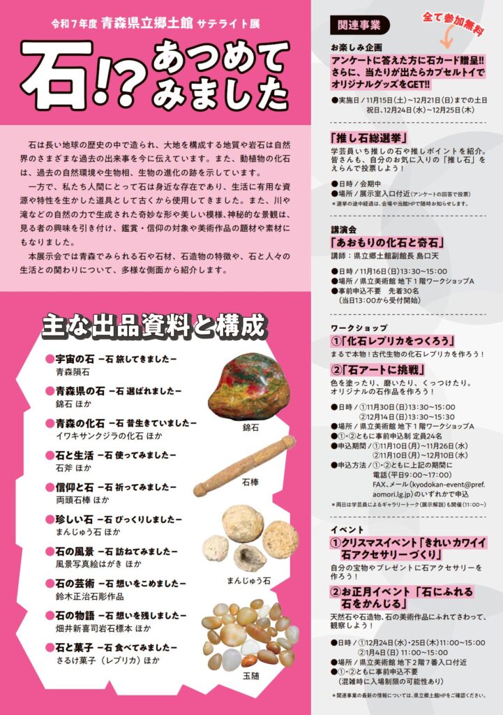 https://www.kyodokan.com/ 令和7年度青森県立郷土館サテライト展 「石!? あつめてみました」 石は長い地球の歴史の中で造られ、大地を構成する地質や岩石は自然界のさまざまな過去の出来事を今に伝えています。また、動植物の化石は、過去の自然環境や生物相、生物の進化の跡を示しています。 一方で、私たち人間にとって石は身近な存在であり、生活に有用な資源や特性を生かした道具として古くから使用してきました。また、川や滝などの自然の力で生成された奇妙な形や美しい模様、神秘的な景観は、見る者の興味を引き付け、鑑賞・信仰の対象や美術作品の題材や素材にもなりました。 本展示会では青森でみられる石や石材、石造物の特徴や、石と人々の生活との関わりについて、多様な側面から紹介します。