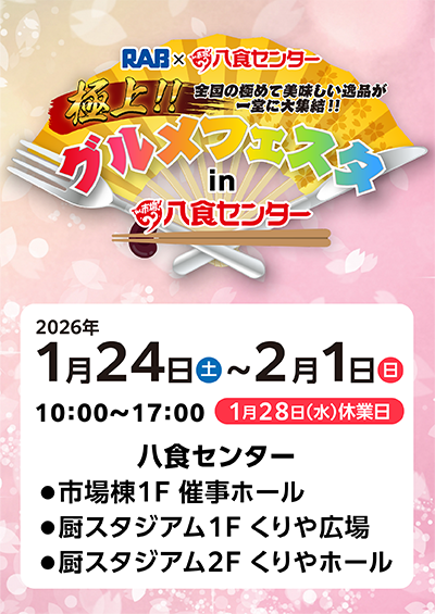 〇タイトルRAB×八食センター極上‼グルメフェスタin八食センター〇会 期2026年1月24日(土)~ 2月1日(日)8日間※1月28日(水)は休業日(毎週水曜日定休)〇開催時間10:00~17:00 〇入場料無 料 〇会 場食のテーマパーク 八食センター ・市場棟1F 催事ホール・厨スタジアム1F くりや広場・厨スタジアム2F くりやホール〒039-1161 青森県八戸市河原木字神才22-2〇企画内容な~かなか手に入らない青森県初登場のグルメ・スイーツや全国の極めて美味しい逸品と究極の品が大集結します。入場無料ですのでお気軽にお立ちより下さい! 今回は3会場で開催します。〇主 催青森放送株式会社協同組合八食センター https://www.rab.co.jp/event/