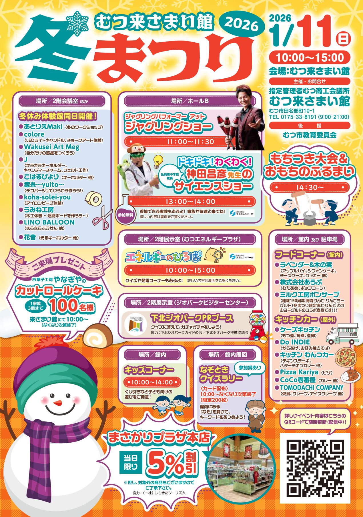 ■日時令和8年1月11日(日曜日)午前10時~午後3時※【同日開催】冬休み体験館■会場むつ来さまい館■内容★ジャグリングパフォーマー アットさんによるジャグリングショー★ドキドキ!わくわく!神田昌彦先生のサイエンスショー・先着150名様、参加無料・当日受付も行いますが、事前申込みがおすすめです。★エネルギーのひろば★下北ジオパークPRブース★キッズコーナー★なぞときクイズラリー★フードコーナー★キッチンカー★もちつき大会&おもちのふるまい など
