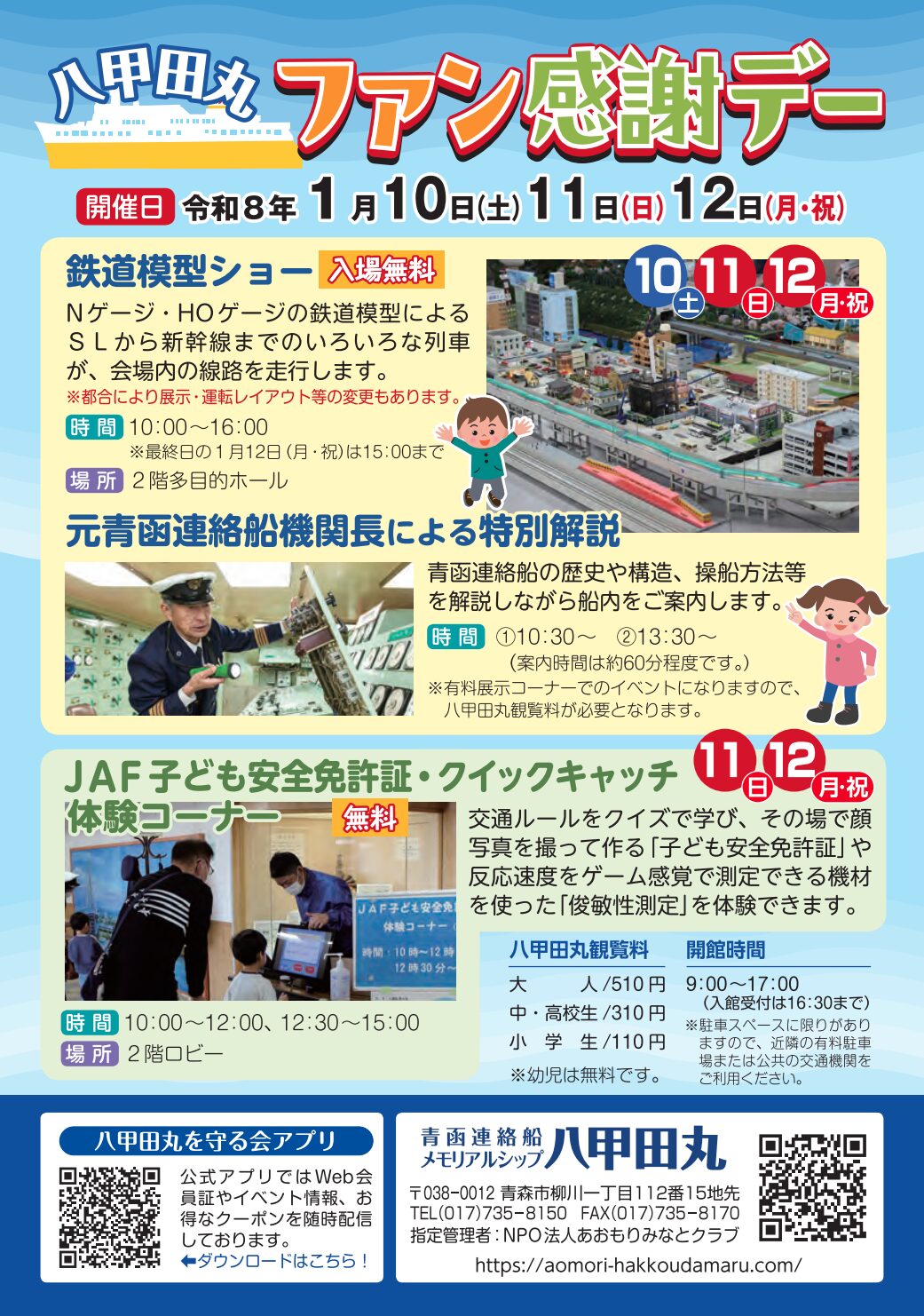 101月(1月 10)10:00 AM12(1月 12)4:00 PM青森市[八甲田丸ファン感謝デー]