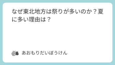 青森情報 なぜ東北地方は祭りが多いのか?夏に多い理由は? 東北地方で夏に祭りが多く開催される理由は、主に地域の気候、農業の特性、そして文化的な背景にあります。気候と農業の影響東北地方は寒冷な気候で、冬が長く、夏が短いという特性があります。このため、農作物の成... 2025.12.12 青森情報